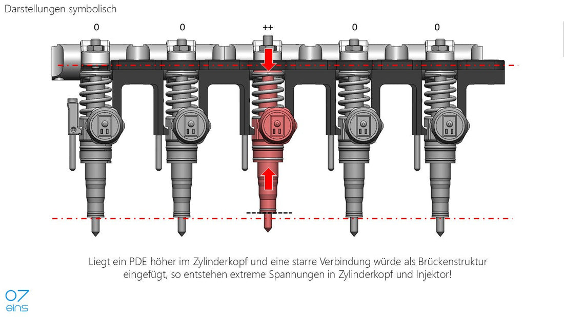 Pri vývoji a opravách motorov VW T5 2,5 TDI sa mnohé dielne a výrobcovia motorov stretávajú so známym problémom: Prvky čerpadlo-dýza (PDE) sú umiestnené v hlave valcov nie všetky v presne rovnakej výške.